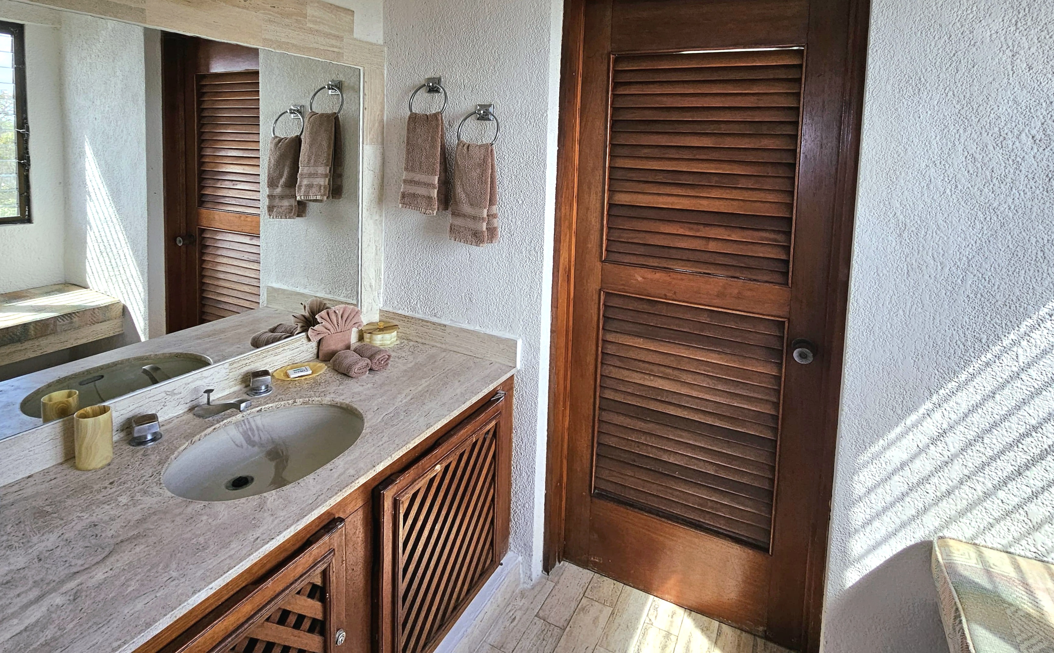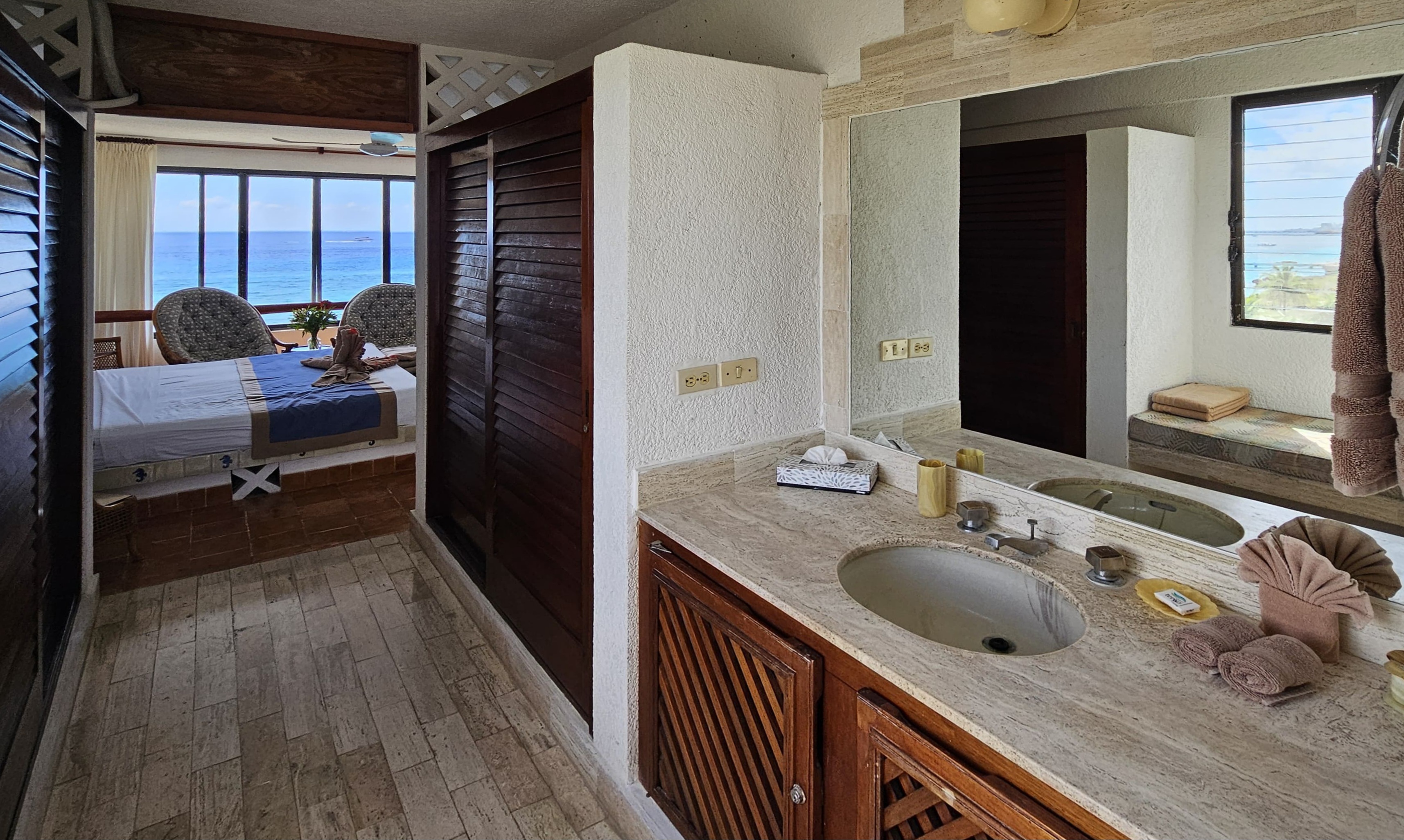 Espectaculares vistas al mar y al atardecer en todo el frente. Esta suite cuenta con dos recamarras. La recámarra principal cuenta con cama King, closet y baño privado (con tina/ducha). La segunda recámarra cuenta con dos camas individuales y closet. Ambas recámarras cuentan con aire acondicionado. Existe un baño completo (con tina/ducha) independiente para la segunda recámarra. La cocina está totalmente equipada, cuenta con fogones, refrigerador/nevera, menaje de cocina y microondas, cafetera, etc.... La espaciosa suite dispone de comedor para 6 personas, zona de estar con televisor de pantalla plana, y otra sala (con 2 sofás camas). Tiene capacidad para acomodar seis personas comodamente.